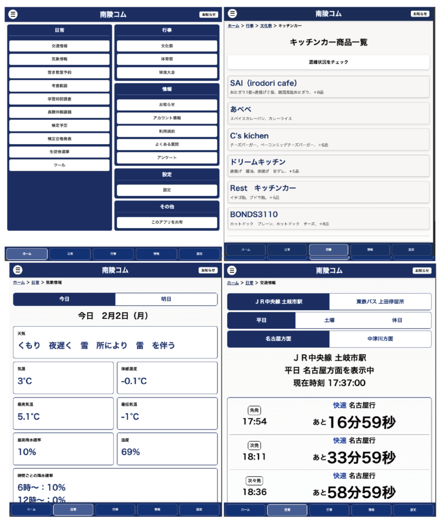 左上: 直感的な操作を可能にするホーム画面。 右上: 文化祭行事のキッチンカー商品一覧画面(売り切れ情報や混雑状況を周知)。 左下: 常に最新の情報を届ける気象情報画面(API連携により取得)。 右下: 交通情報画面(電車の出発時刻を保持し、残り時間を自動更新)。