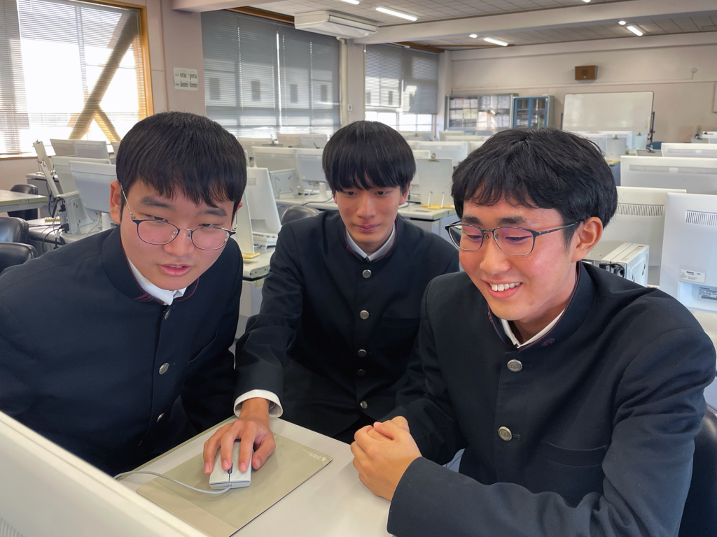 左から河村 憲彦教諭、システム管理コース 3年生 小栗 琉聖さん、丸谷 竜輝さん、水野 堪太さん